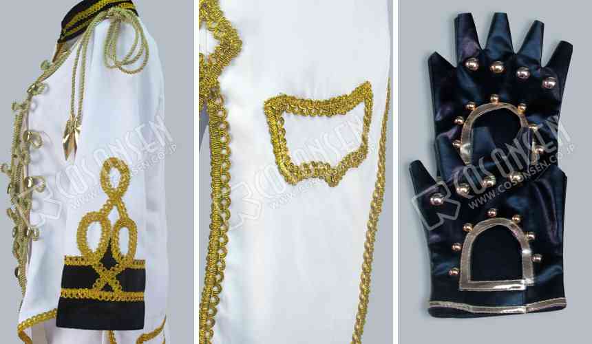 白を基調したポリ混紡生地で製作して、華やかな肩章も付きます。白いスーツは燕尾服のようにしています。前身頃には金色のダブルボタンを付きます。とても華やかです。