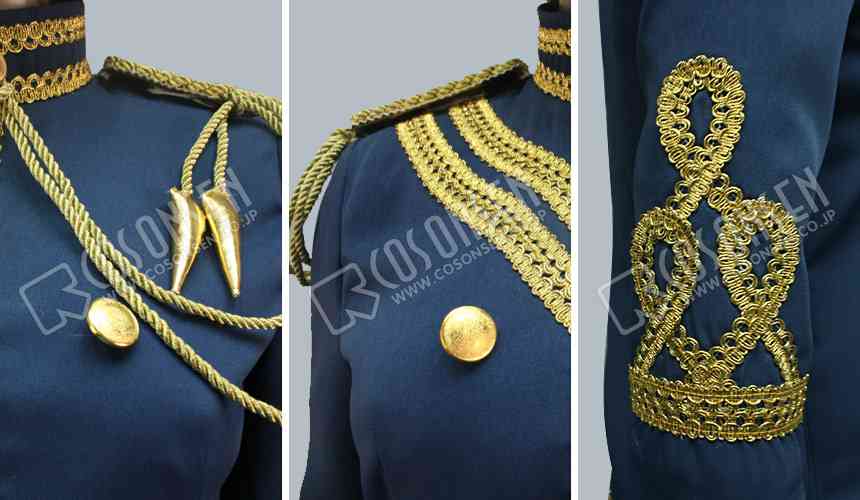 ブルーを基調したポリ混紡生地で製作して、華やかな肩章も付きます。前身頃は金色のダブルボタンを付きます。チエンもあります。