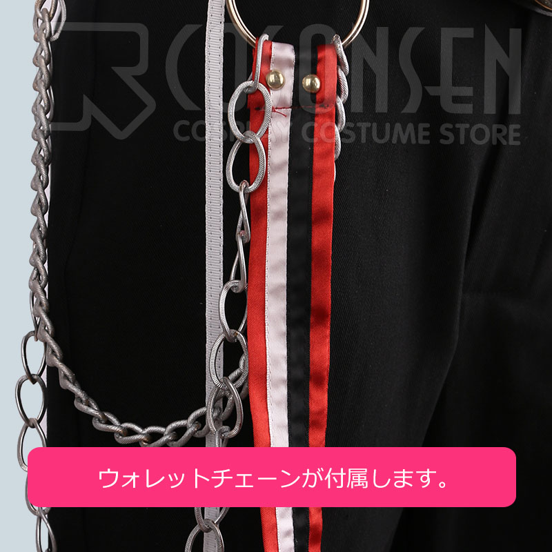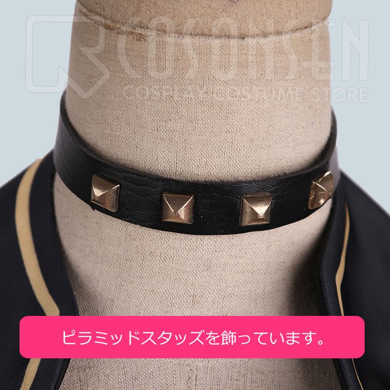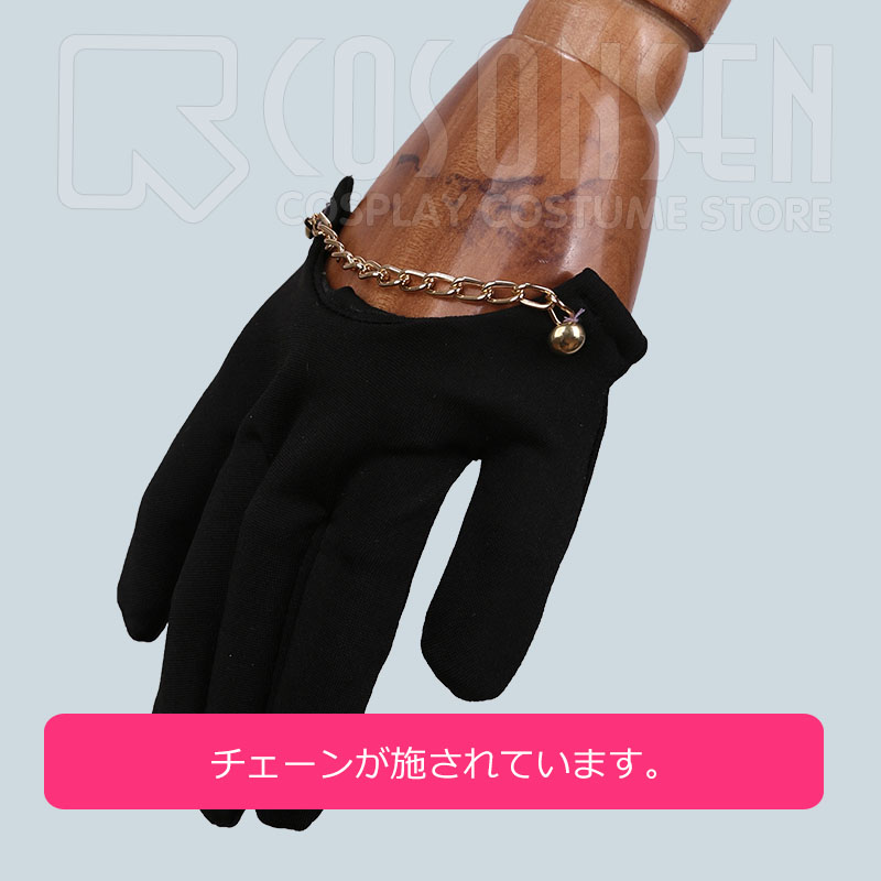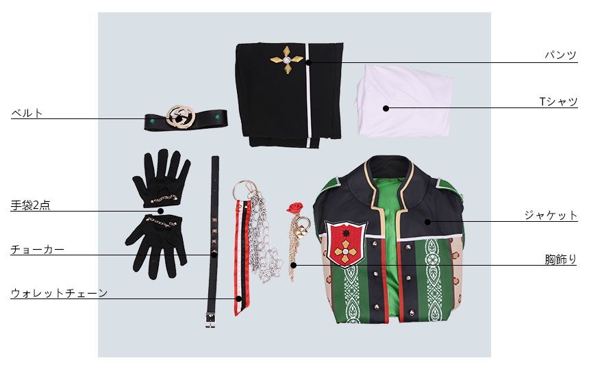チョーカー、胸飾り、ウォレットチェーン、ベルト、手袋2点も付属しています。