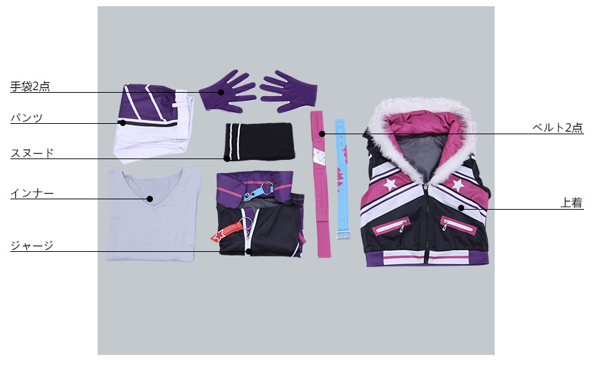 上着、ジャージ、インナー、パンツ、飾り物(スヌード、手袋2点、ベルト2点)
