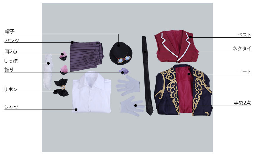 コート、ベスト、シャツ、パンツ、飾り物(帽子、耳2点、リボン、手袋2点、飾り、ネクタイ、しっぽ)