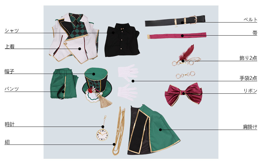 上着、シャツ、パンツ、飾り物(帽子、肩掛け、リボン、飾り2点、ベルト、紐、帯、時計、手袋2点)