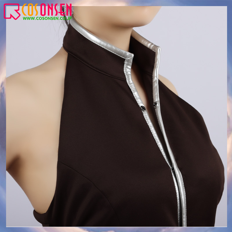 光沢布で制作しています。襟が立っていて、周りに金色の合皮で縁取りされていて、おしゃれに見えます。後ろにスリットが入っていて、裾に原作に忠実な模様が綺麗に縫い付けられて再現度が高いです。