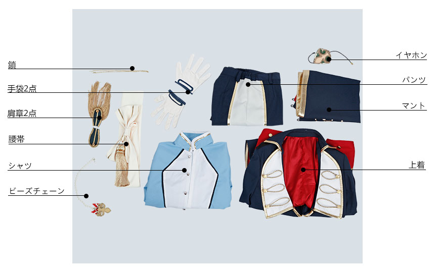 マント、上着、シャツ、パンツ、飾り物(ビーズチェーン、鎖、肩章2点、手袋2点、腰帯)