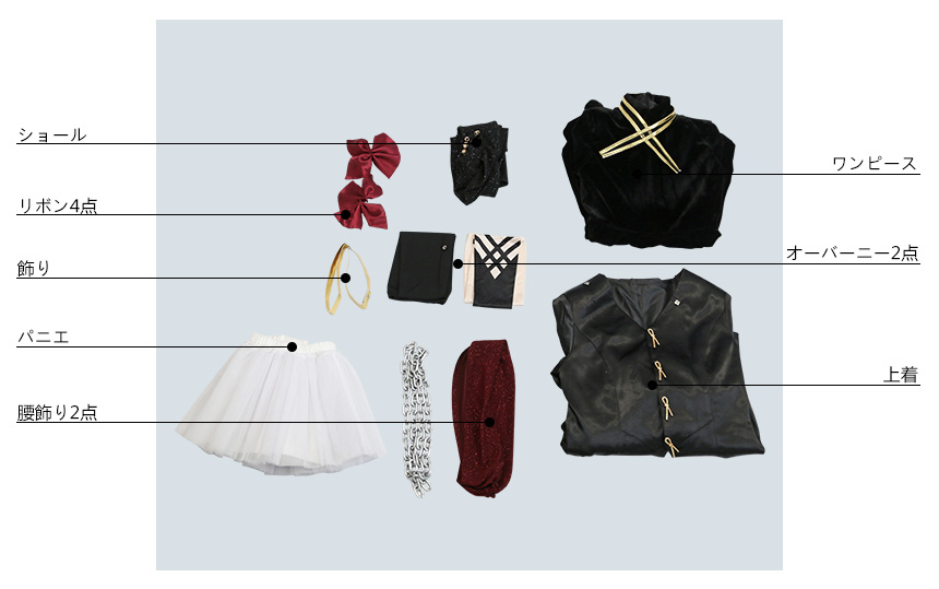 パニエ、リボン4点、ショール、腰飾り2点、オーバーニー2点、飾りも付属しています。