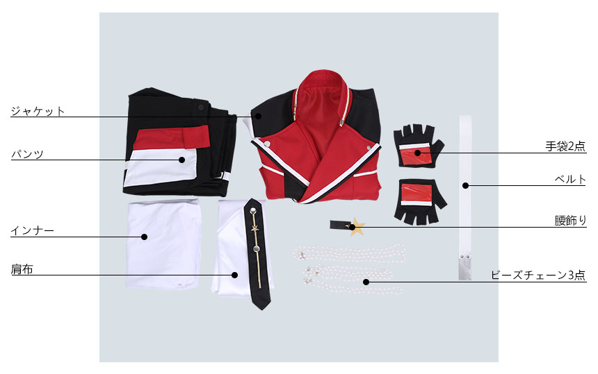 ジャケット、インナー、パンツ、飾り物(肩布、腰飾り、手袋2点、チェーン3点、ベルト)