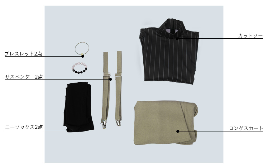 カットソー、ロングスカート、飾り物(サスペンダー2点、ブレスレット2点、 ニーソックス2点)