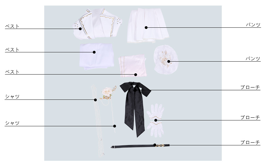 ジャケット、インナー、パンツ、飾り物(髪飾り、襟飾り2点、手袋2点、腰布、ベルト、リボン、ビーズチェーン)