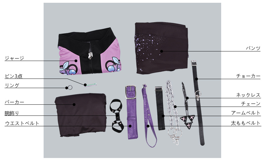 ジャージ、パーカー、パンツ、飾り物(ピン3点、リング、ウエストベルト、サスペンダー、太ももベルト、アームベルト、腕飾り、チョーカー、ネックレス、チェーン)