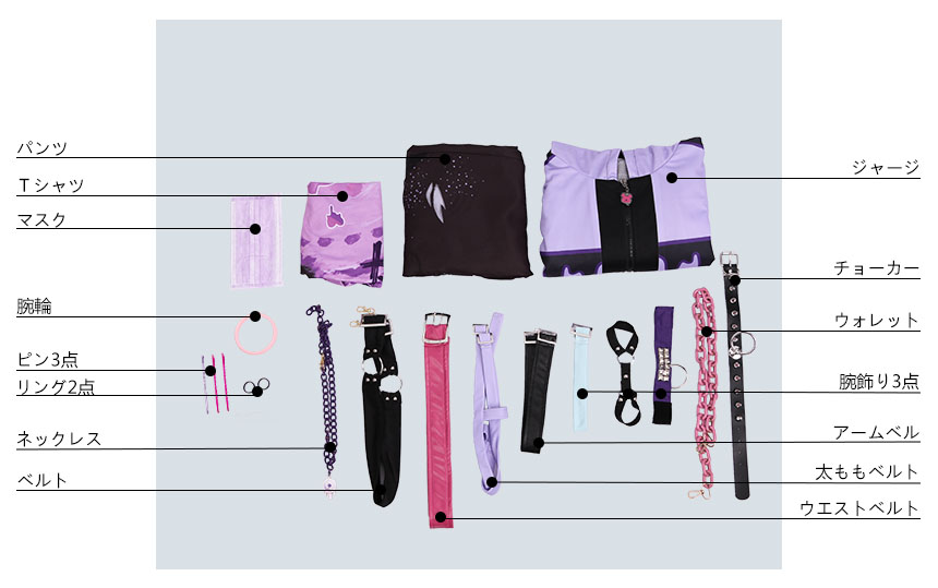 マスク、腕輪、ピン3点、リング2点、ネックレス、ベルト、ウエストベルト、太ももベルト、アームベルト2点、腕飾り3点、ウォレットチェーン、チョーカーも付属しています。