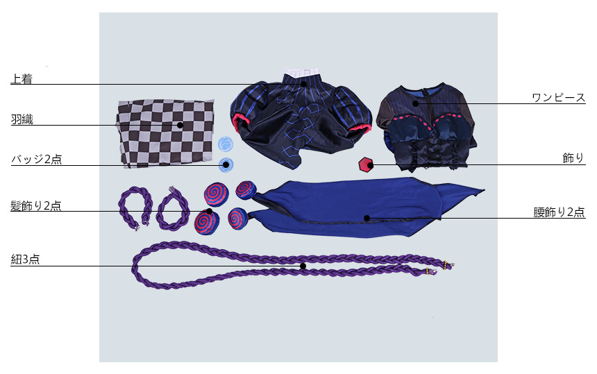 髪飾り2点、飾り、腰飾り2点、紐3点、バッジ2点も付属しています。