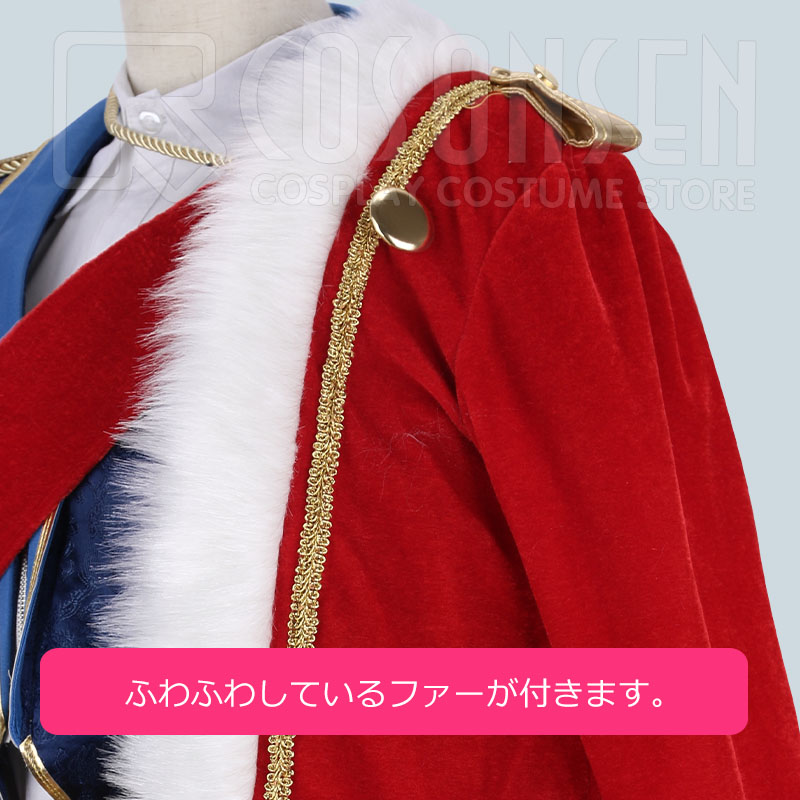 ベルベット生地で製作されました。肩のところに金色の肩章が施されます。裾にふわふわとしたファーが付きます。
