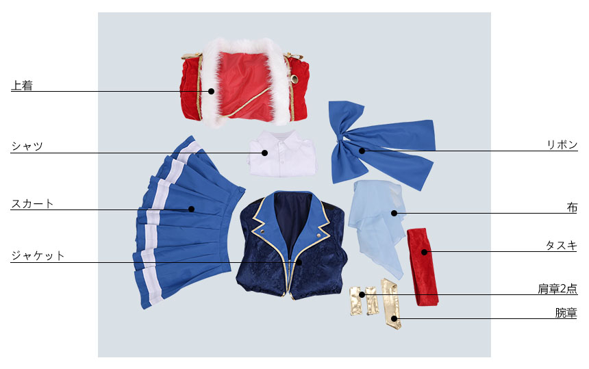 上着、ジャケット、シャツ、スカート、飾り物(タスキ、腕章、肩章2点、リボン、布)
