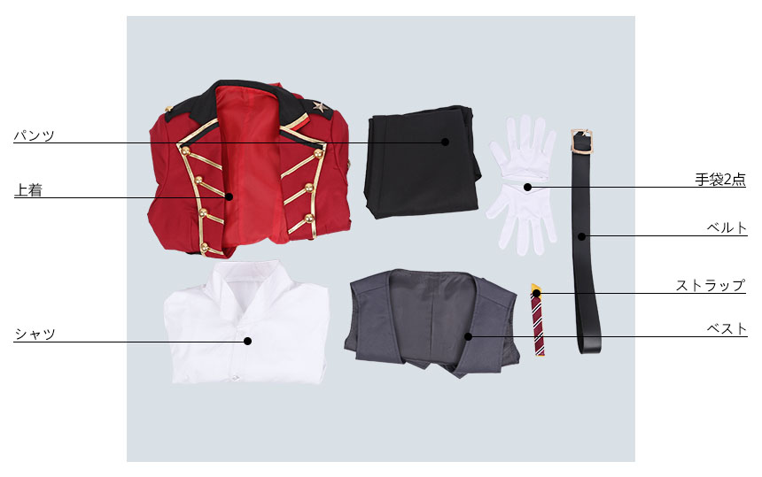 上着、ベスト、シャツ、パンツ、飾り物(ネクタイ、ストラップ、チェーン2点、手袋2点、ベルト)