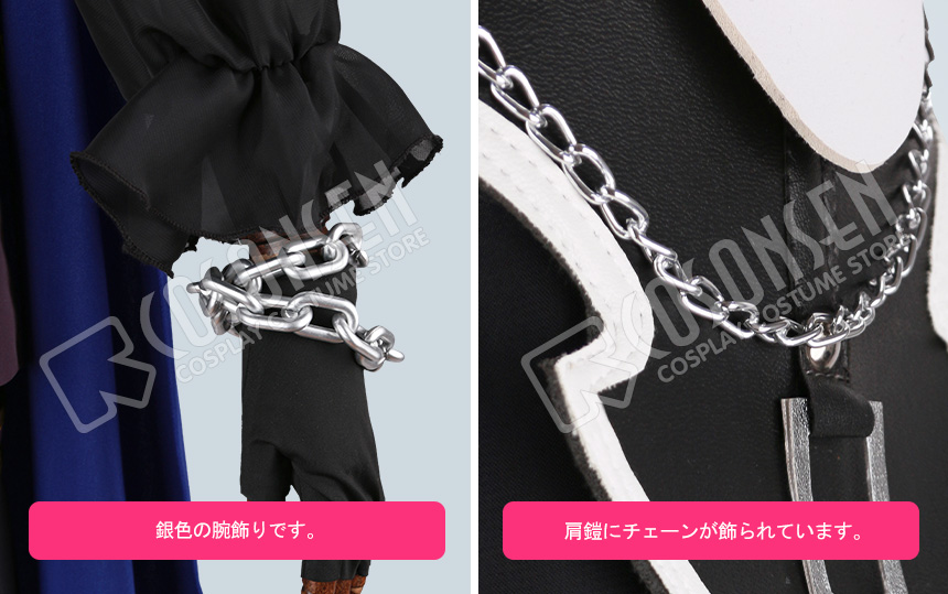 眼帯、バンド2点、ベルト、チェーン4点、手袋2点、ブローチ、チョーカー、肩飾り2点も付属しています。
