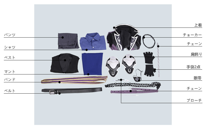 マント、上着、ベスト、シャツ、パンツ、飾り物(眼帯、バンド2点、ベルト、チェーン4点、手袋2点、ブローチ、チョーカー、肩飾り2点)