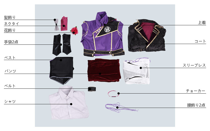 上着、コート、ベスト、シャツ、スリーブレス、パンツ、飾り物(ネクタイ、髪飾り、花飾り、手袋2点、ベルト、チョーカー、腰飾り2点)