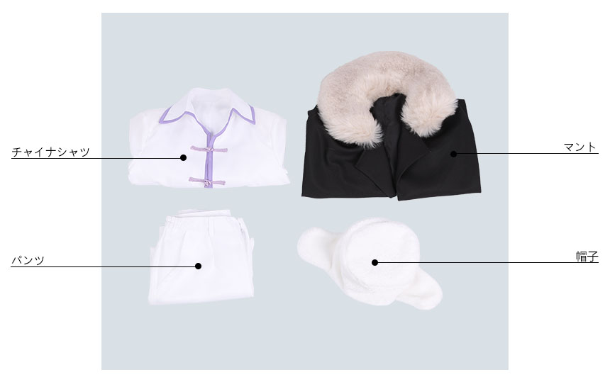 マント、チャイナシャツ、パンツ、飾り物(帽子)