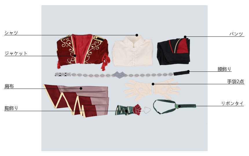 ジャケット、シャツ、パンツ、飾り物(肩布、リボンタイ、胸飾り、腰飾り、手袋2点)