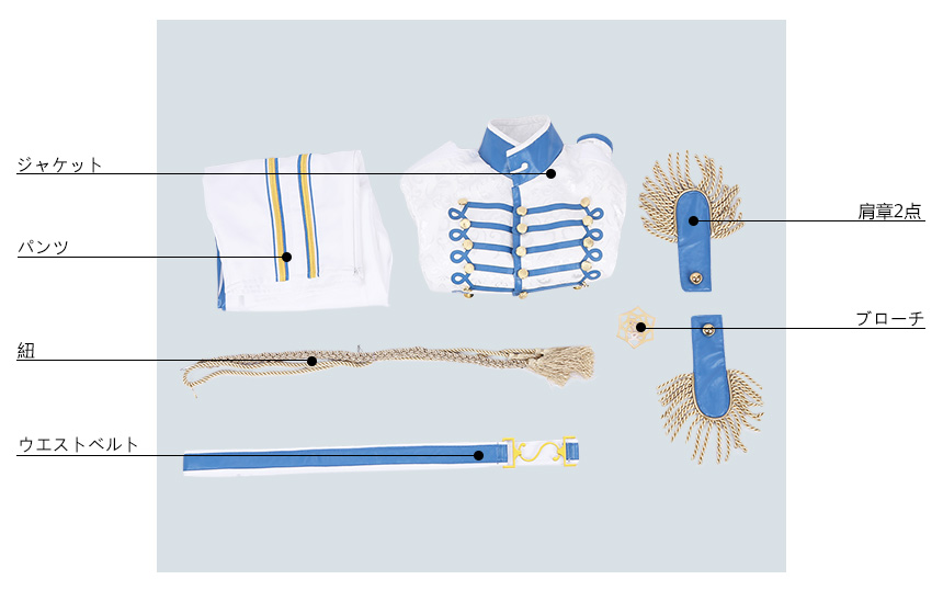 ジャケット、パンツ、飾り物(ブローチ、紐、ウエストベルト、肩章2点)