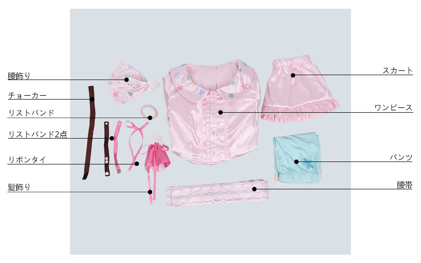 ワンピース、スカート、パンツ、飾り物(髪飾り、リボンタイ、腰飾り、チョーカー、腰帯、リストバンド3点)