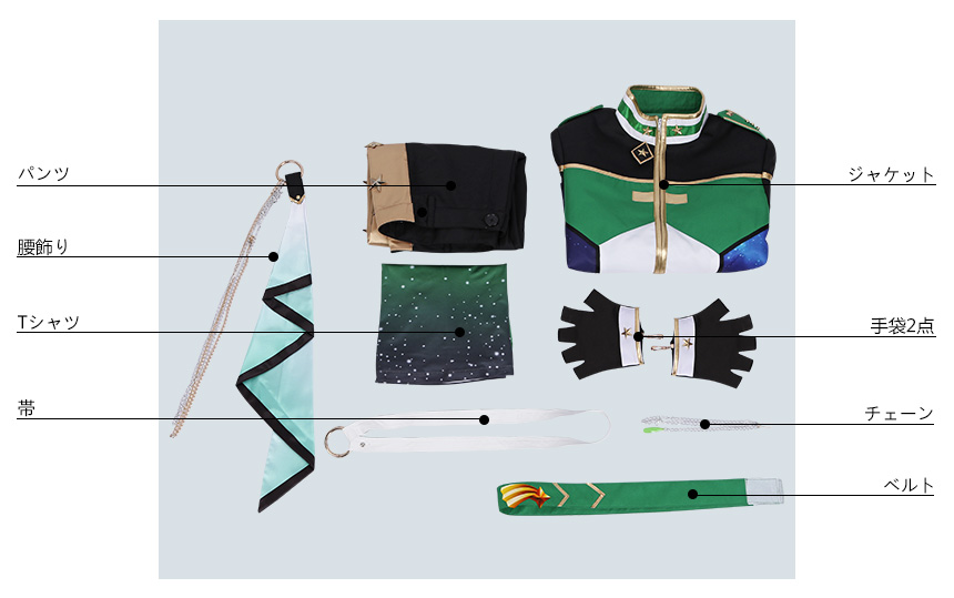 ジャケット、Tシャツ、パンツ、飾り物(チェーン、帯、ベルト、腰飾り、手袋2点)