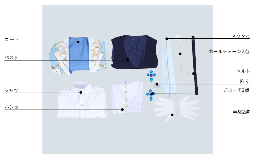 コート、ベスト、シャツ、パンツ、飾り物(ネクタイ、ボールチェーン2点、ベルト、飾り、ブローチ2点、手袋2点)