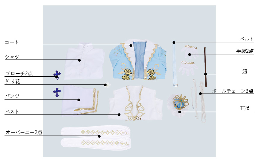 コート、ベスト、シャツ、パンツ、飾り物(ブローチ2点、飾り花、ベルト、手袋2点、ボールチェーン3点、紐、王冠)