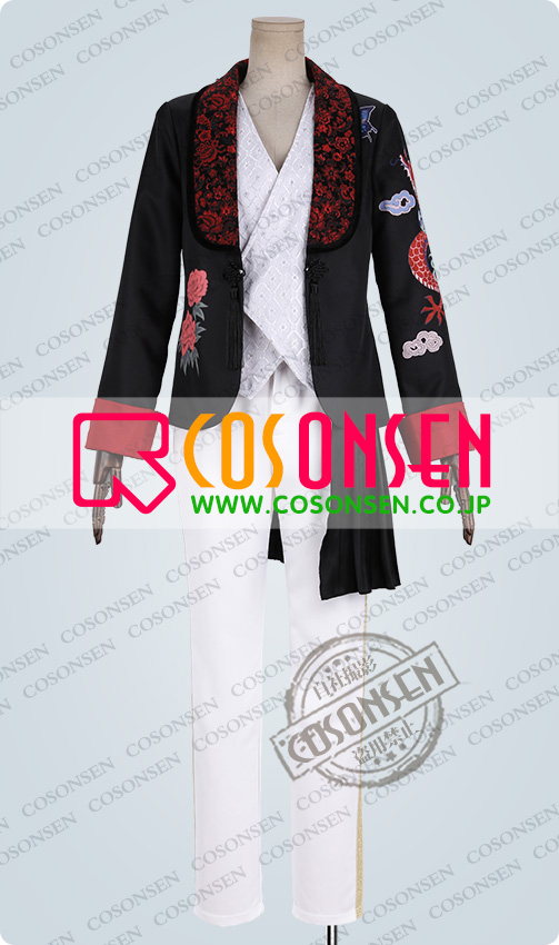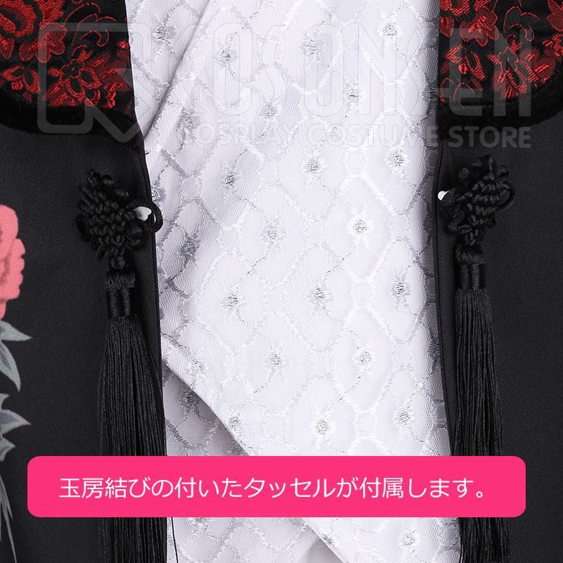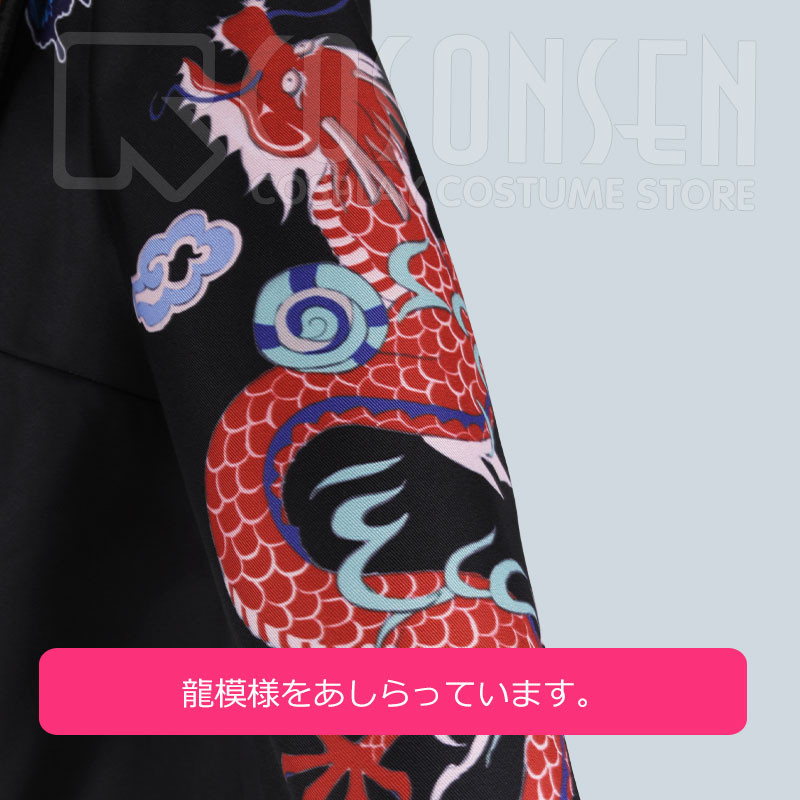 ポリエステルツイルで製作されました。ショールカラーに暗い赤色の花が刺繍されます。袖に龍の模様をあしらっています。