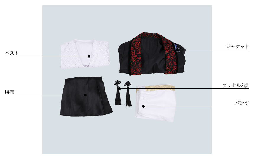 ジャケット、ベスト、パンツ、飾り物(腰布、タッセル2点)