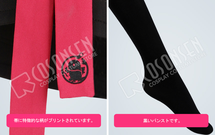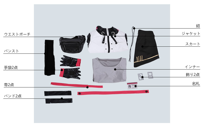 パンスト、名札、ウエストポーチ、手袋2点、飾り2点、帯2点、バンド2点も付属しています。