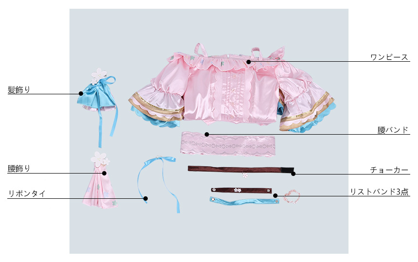 腰バンド、リボンタイ、腰飾り、髪飾り、チョーカー、リストバンド3点も付属しています。