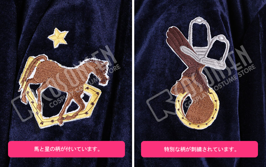 ベルベット生地で製作しました。フロントに馬と星の柄が刺繍されています。ファスナーがついている簡単で着用できるジャケットです。