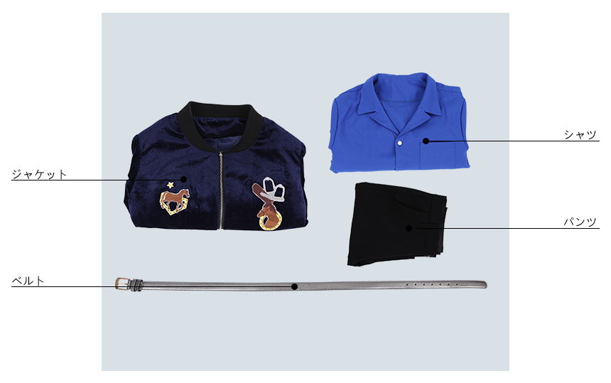ジャケット、シャツ、パンツ、飾り物(ベルト)