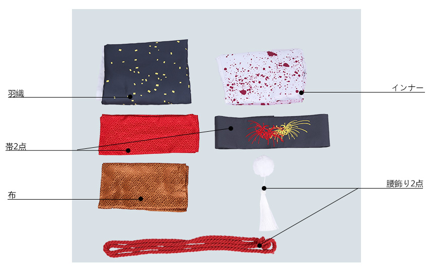 帯2点、腰飾り2点、布も付属しています。