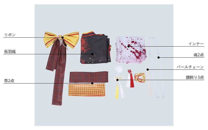 帯2点、腰飾り3点、パールチェーン、リボン、縄2点も付属しています。