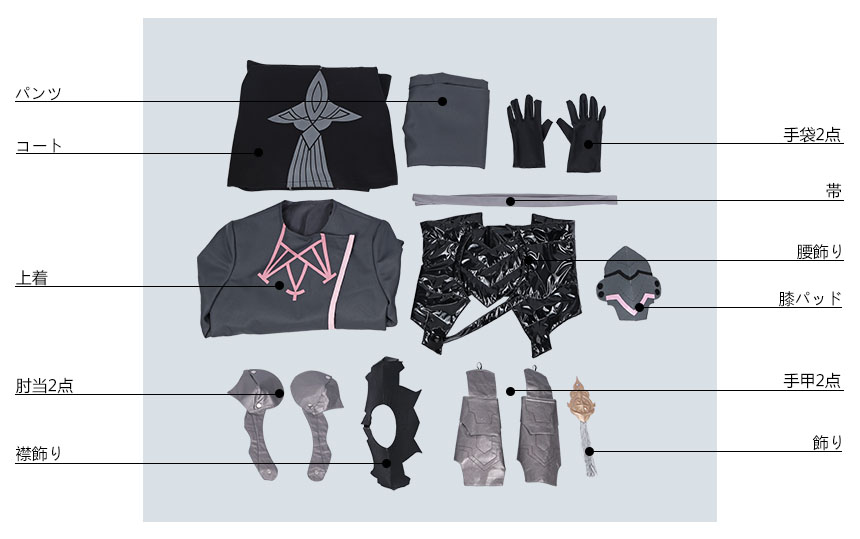 コート、上着、パンツ、飾り物(腰飾り、手袋2点、肘当2点、帯、飾り、膝パッド、手甲2点、襟飾り)