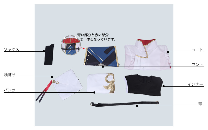 マント、コート、インナー、パンツ、飾り物(ソックス、帯、頭飾り)