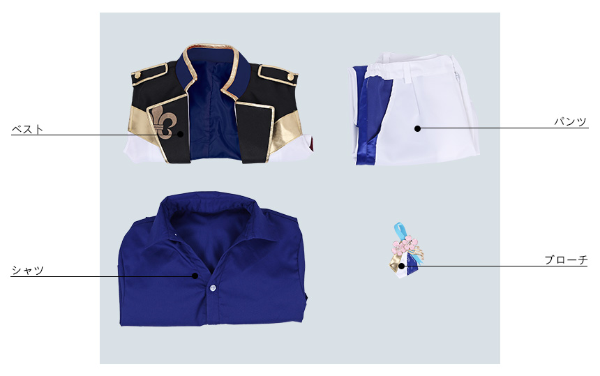 ベスト、シャツ、パンツ、飾り物(ブローチ)