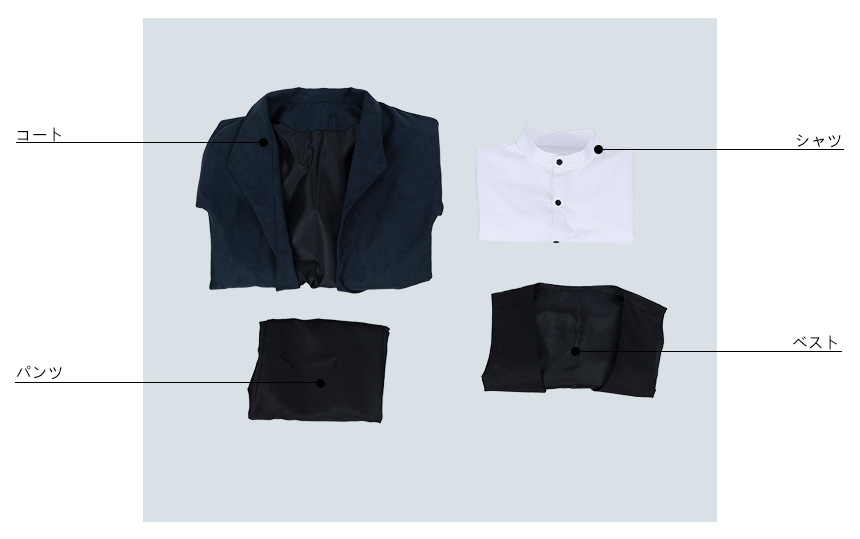 コート、ベスト、シャツ、パンツ