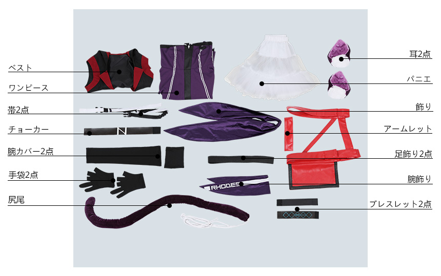 腕飾り2点、ブレスレット2点、チョーカー手袋2点、腕カバー2点、飾り、帯2点、尻尾、耳2点、腿飾り2点、ニーソックス2点も付属しています。