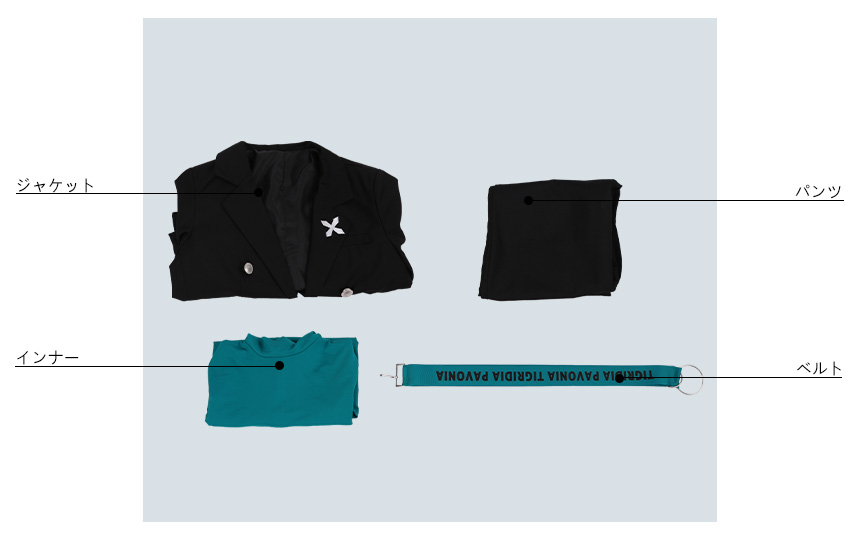 ジャケット、インナー、パンツ、飾り物(ベルト)