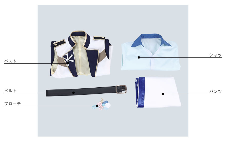 ベスト、シャツ、パンツ、飾り物(ブローチ、ベルト)