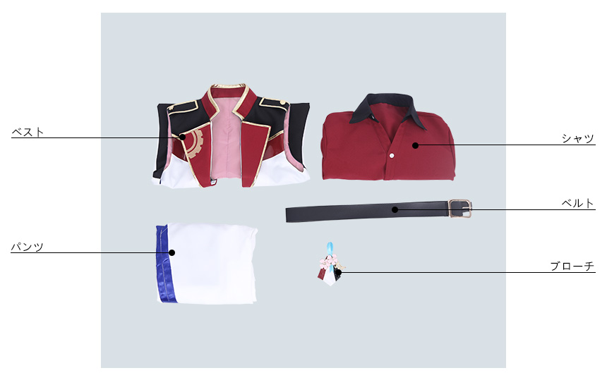 ベスト、シャツ、パンツ、飾り物(ブローチ、ベルト)