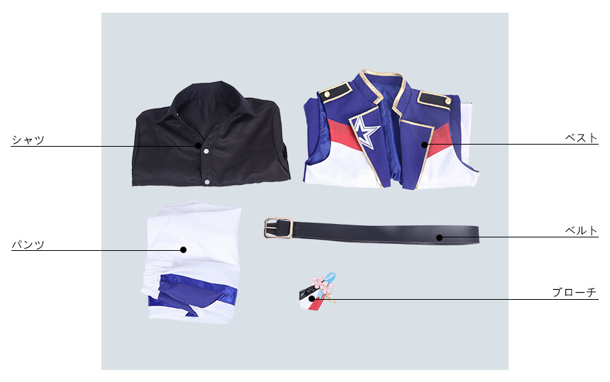ベスト、シャツ、パンツ、飾り物(ブローチ、ベルト)