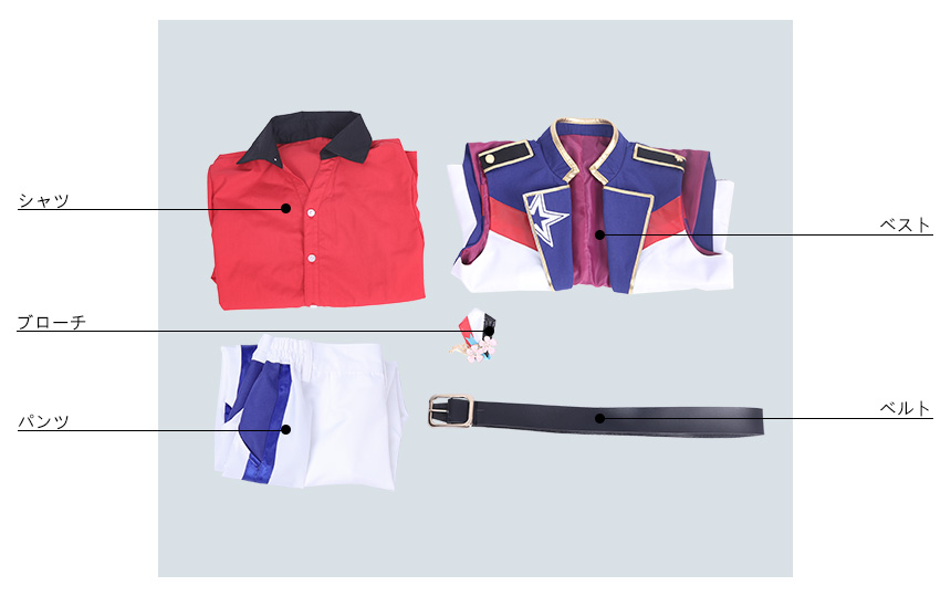 ベスト、シャツ、パンツ、飾り物(ブローチ、ベルト)