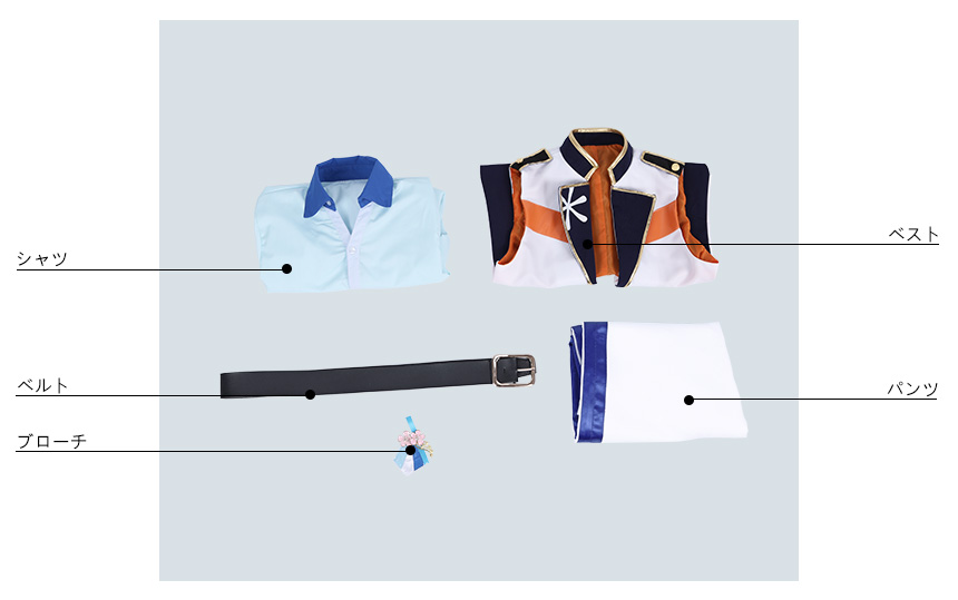 ベスト、シャツ、パンツ、飾り物(ブローチ、ベルト)