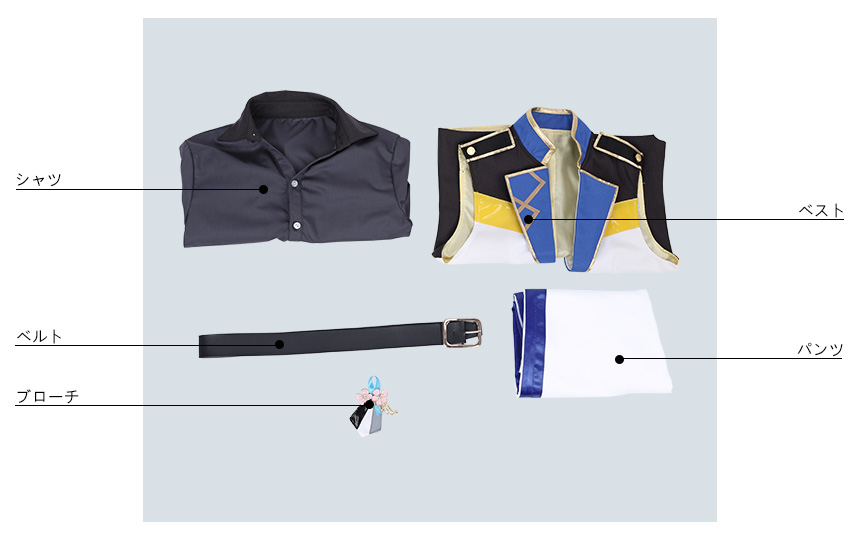ベスト、シャツ、パンツ、飾り物(ブローチ、ベルト)