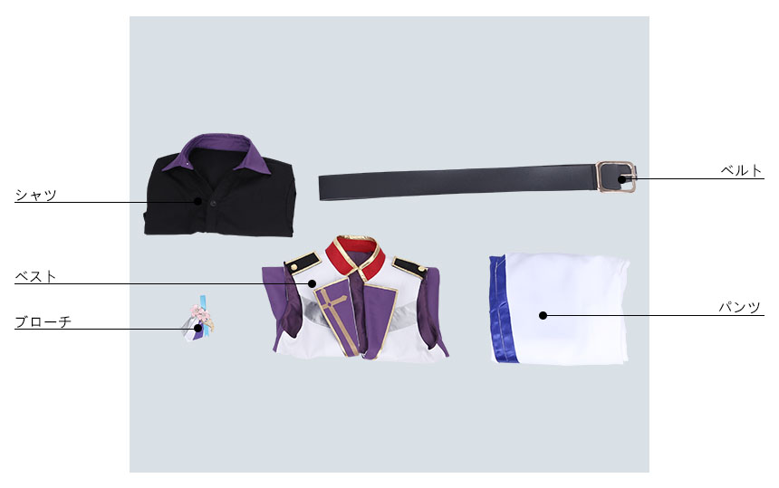 ベスト、シャツ、パンツ、飾り物(ブローチ、ベルト)