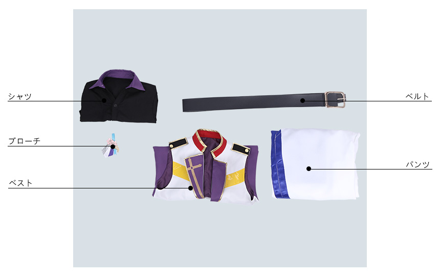 ベスト、シャツ、パンツ、飾り物(ブローチ、ベルト)